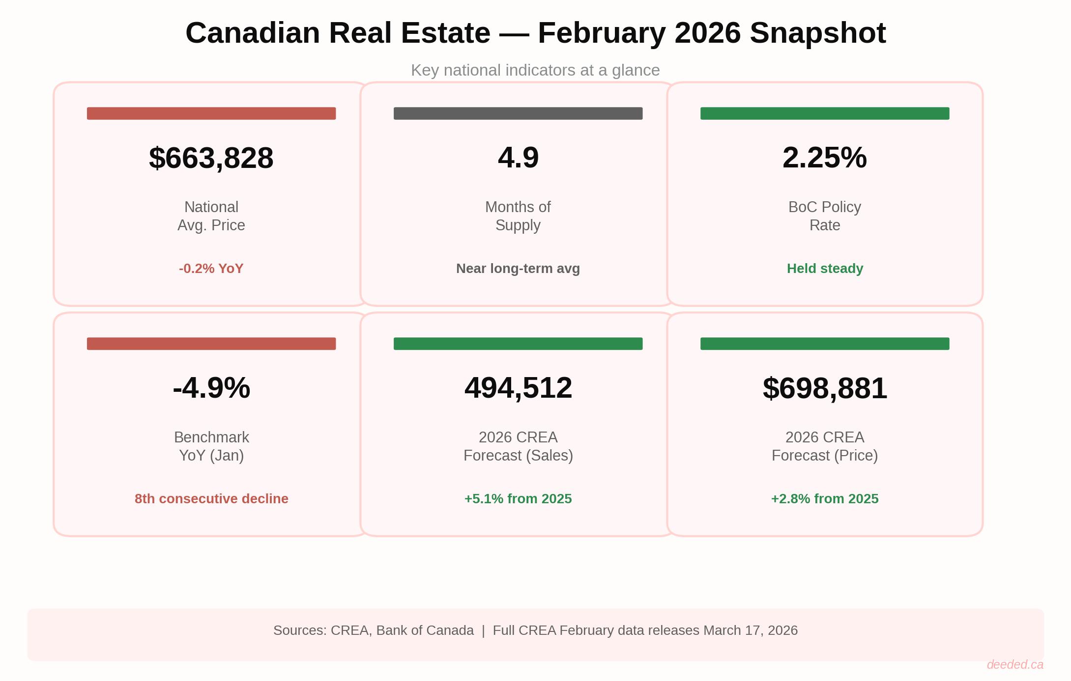 CREA forecasts approximately 494,512 residential transactions nationally in 2026, a 5.1% increase over 2025, with the national average price forecast to rise 2.8% to $698,881 on an annual basis. The recovery, however, is expected to be back-half loaded — contingent on trade resolution, sustained low rates, and the gradual return of sidelined buyers.