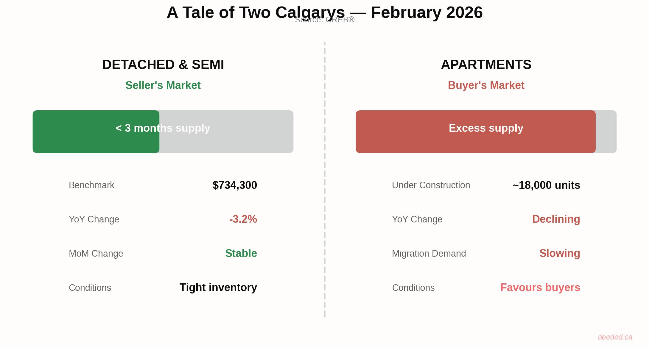 The most striking dynamic in Calgary is the bifurcation between property types. Detached and semi-detached homes remain relatively tight, with less than three months of supply, still firmly in seller's territory. The detached benchmark price of $734,300 is down 3.2% year-over-year but holding steady month-over-month.