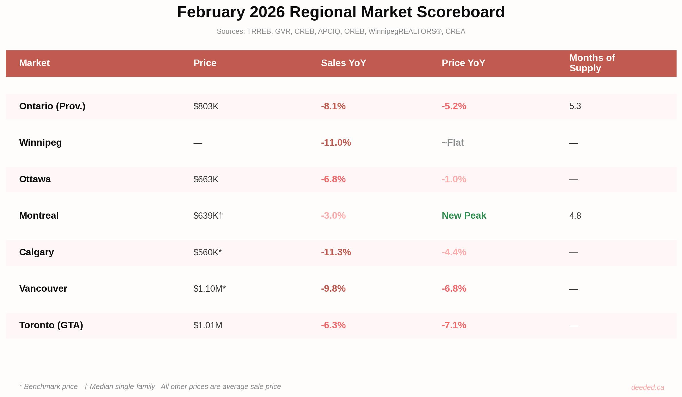 February 2026 delivered a reality check across much of the Canadian housing market. Sales activity remained below historical averages in most major centres, year-over-year prices continued their decline in Ontario and British Columbia, and the ongoing U.S.-Canada tariff standoff injected fresh uncertainty into an already cautious market. Yet underneath the headline weakness, regional divergence is widening — and for professionals who know where to look, February's data tells a more nuanced story than the bearish headlines suggest.