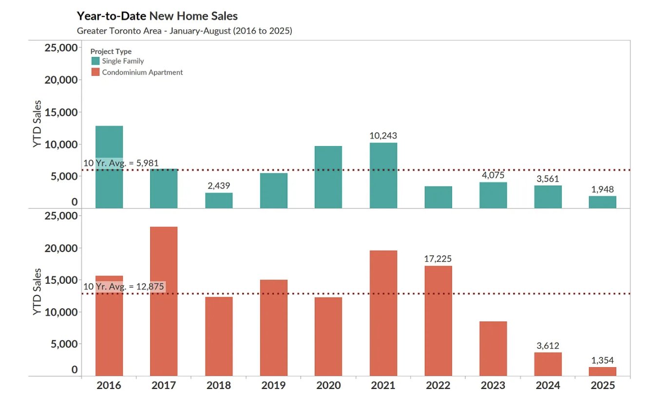 The Greater Toronto Area's new home market has experienced a dramatic downturn, with 2025 sales tracking at historic lows. Through August 2025, only 1,948 single-family homes and 1,354 condominium apartments have sold, representing drops of 67% and 92% respectively compared to the 10-year averages.