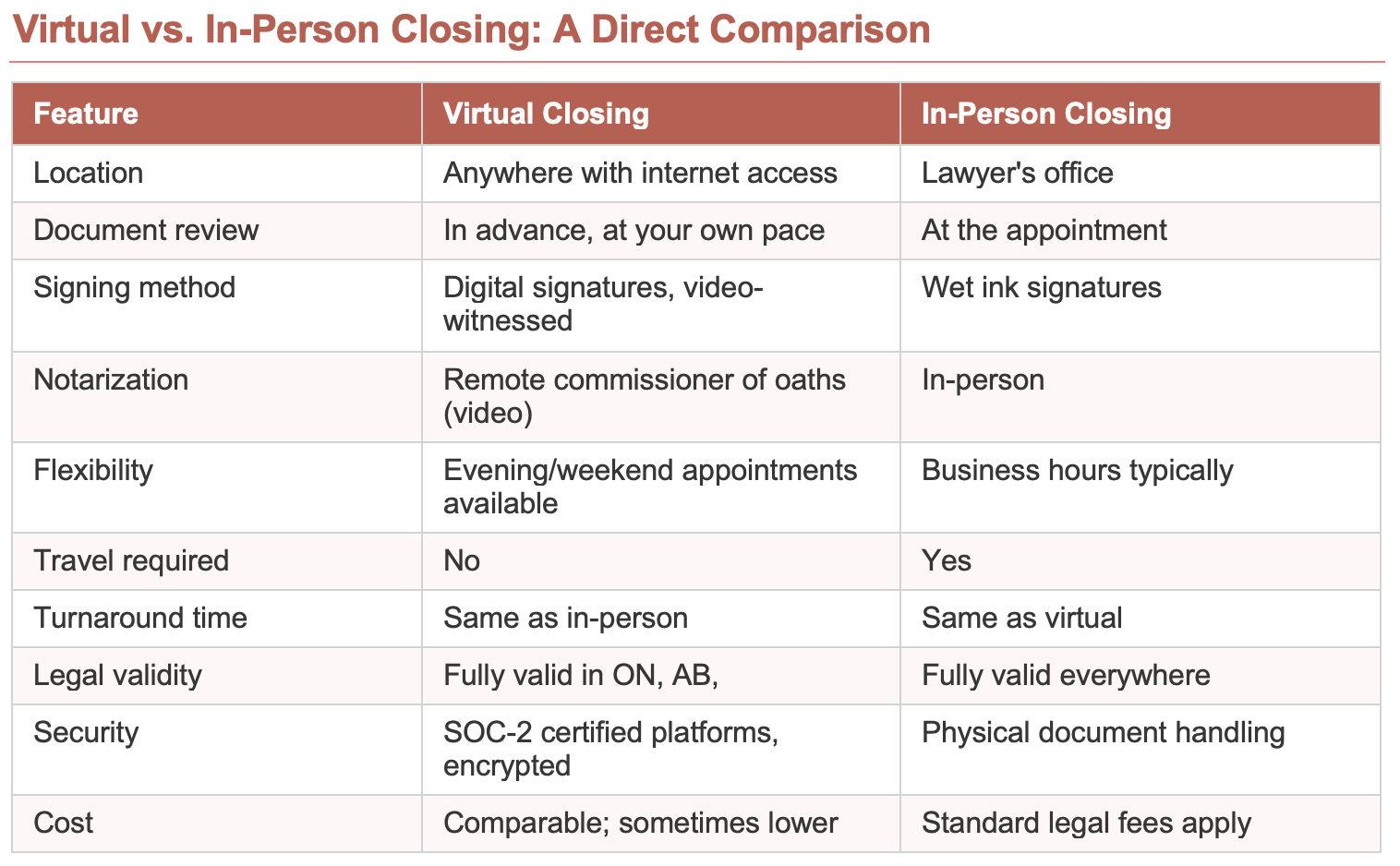 Priya is a first-time homebuyer purchasing a $620,000 condo in Toronto. She works full-time as a project manager and her closing date is on a Thursday. Taking a half-day off work to visit a lawyer's office in the middle of the city would cost her vacation time and parking — minor inconveniences, but real ones.